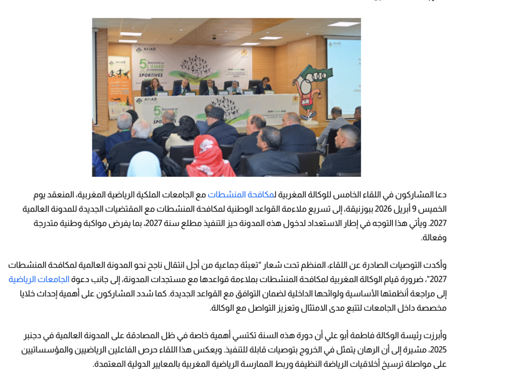 المغرب 28 : بوزنيقة.. دعوة لتسريع ملاءمة قواعد مكافحة المنشطات مع المدونة العالمية 2027