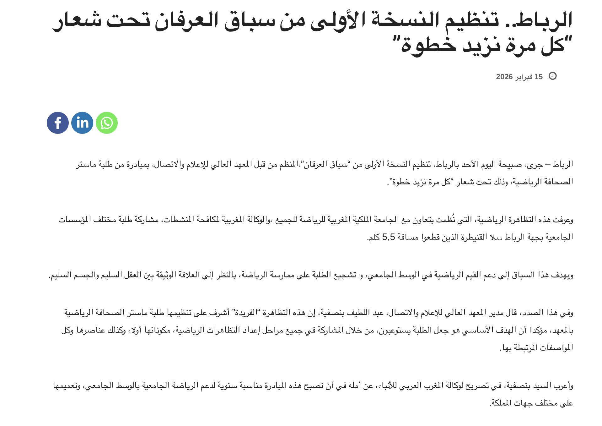 Revue de presse MAP: الرباط.. تنظيم النسخة الأولى من سباق العرفان تحت شعار “كل مرة نزيد خطوة 16 février 2026