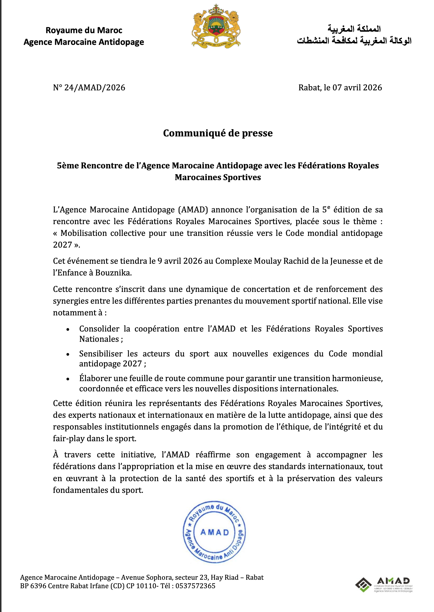 Communiqués 5ème Rencontre de l’Agence Marocaine Antidopage avec les Fédérations Royales Marocaines Sportives 8 avril 2026