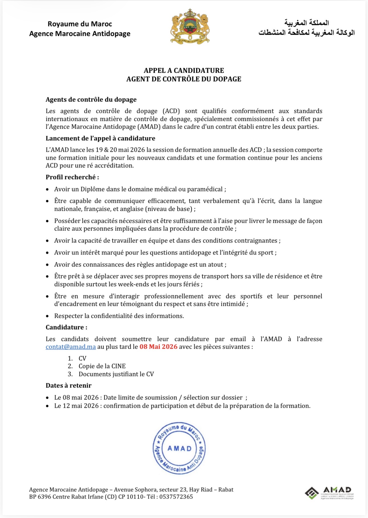 APPEL A CANDIDATURE AGENT DE CONTRÔLE DU DOPAGE