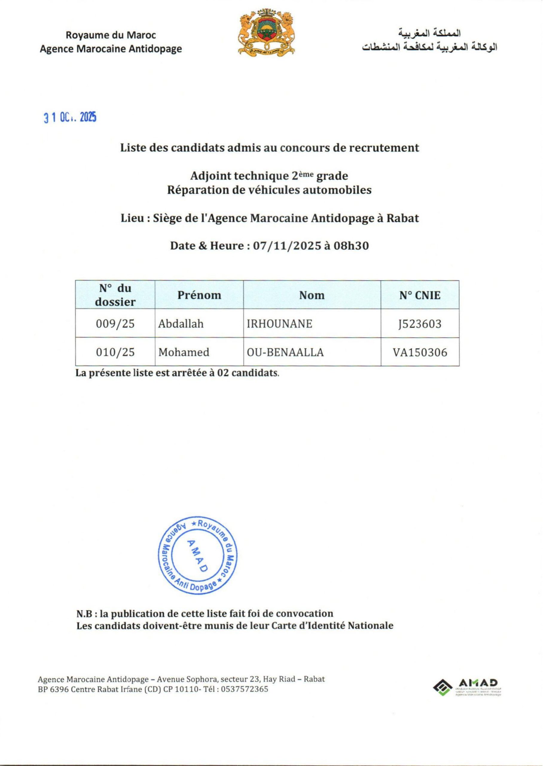 ACTUALITES Liste des candidats admis au concours de rectrutement : Adjoint technique 2ème grade réparation de véhicule automobiles 31 octobre 2025