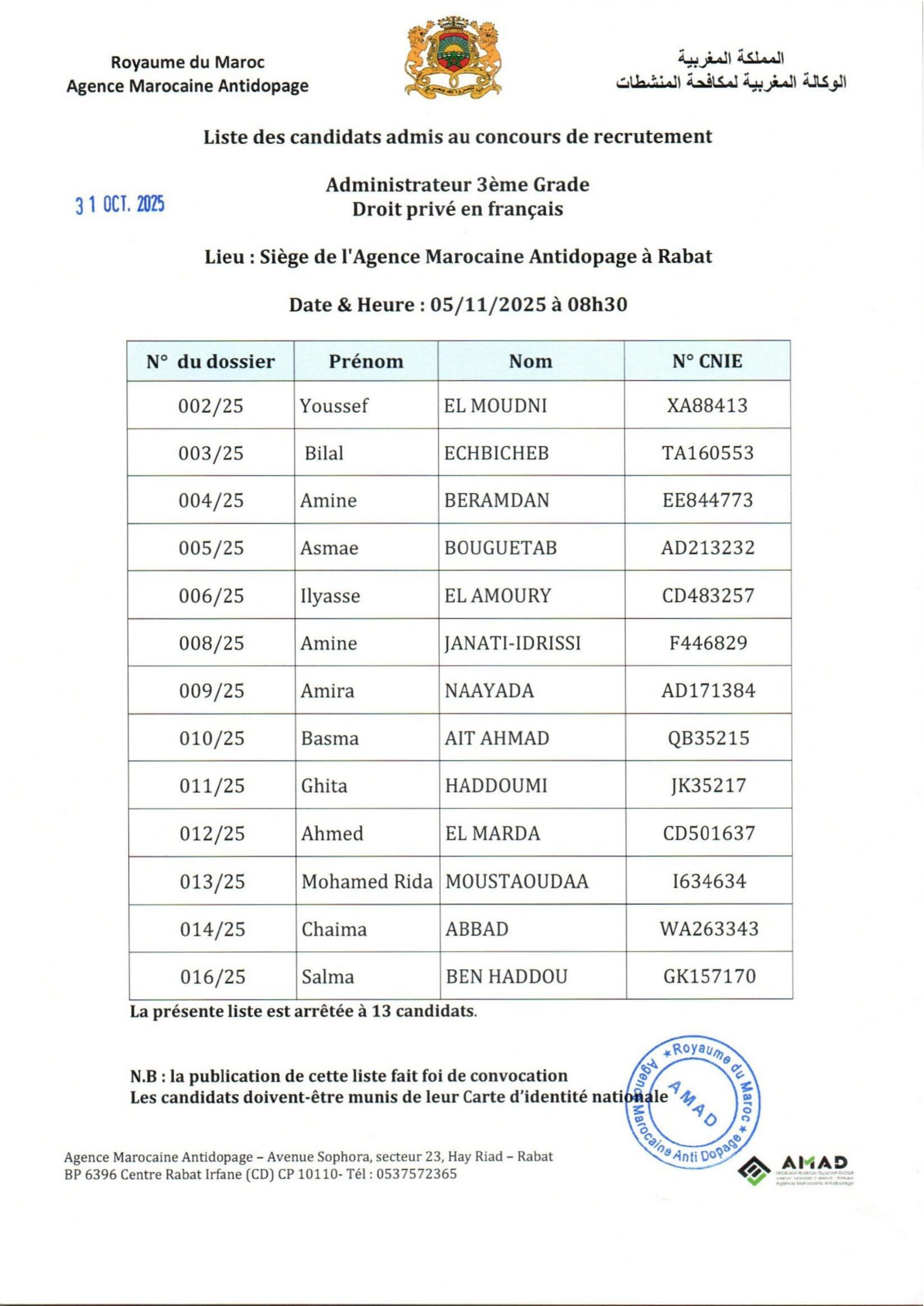 ACTUALITES Liste des candidats admis au concours de rectrutement : Administrateur 3ème grade droit privé en français 31 octobre 2025