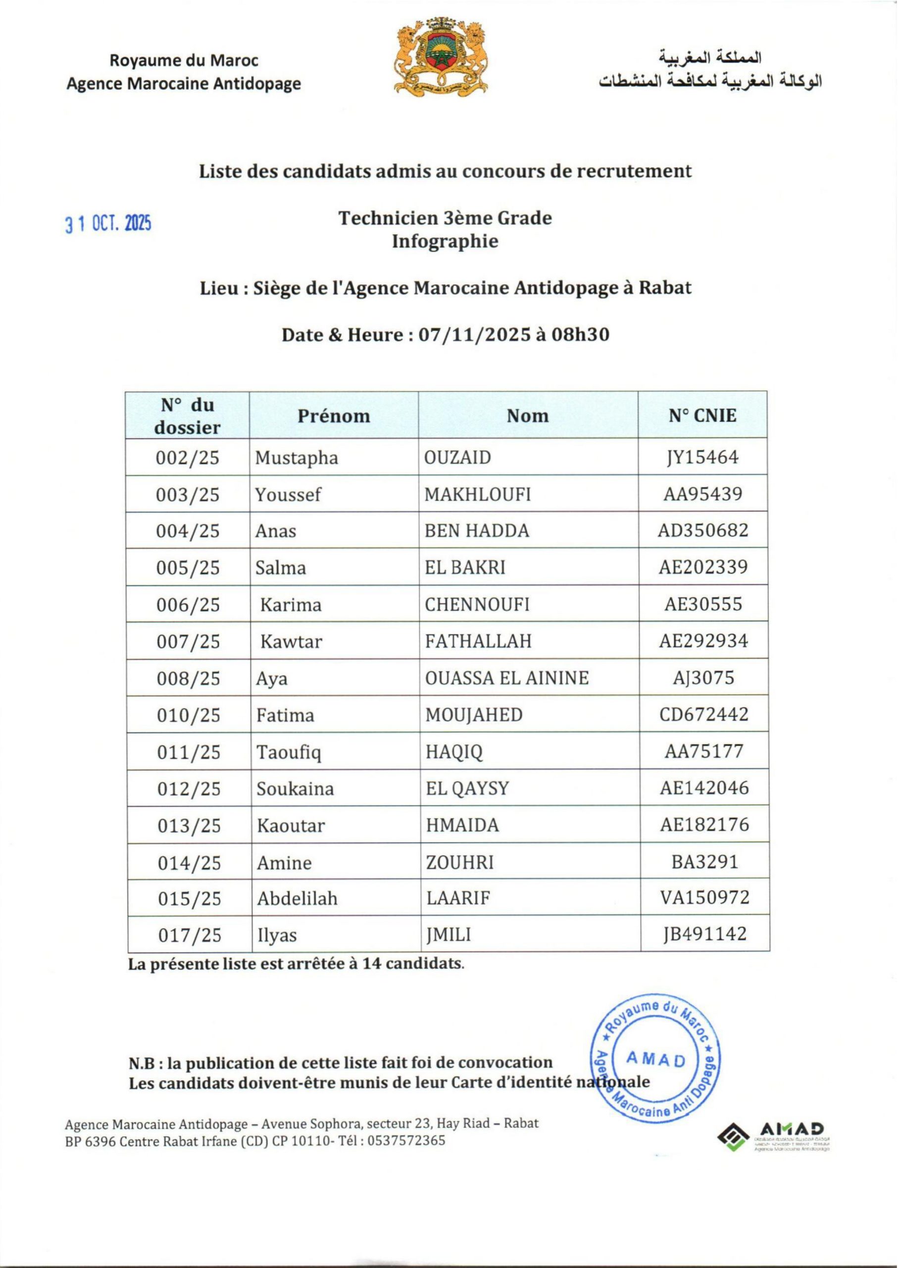 ACTUALITES Liste des candidats admis au concours de rectrutement : Technicien 3ème grade Infographie 31 octobre 2025
