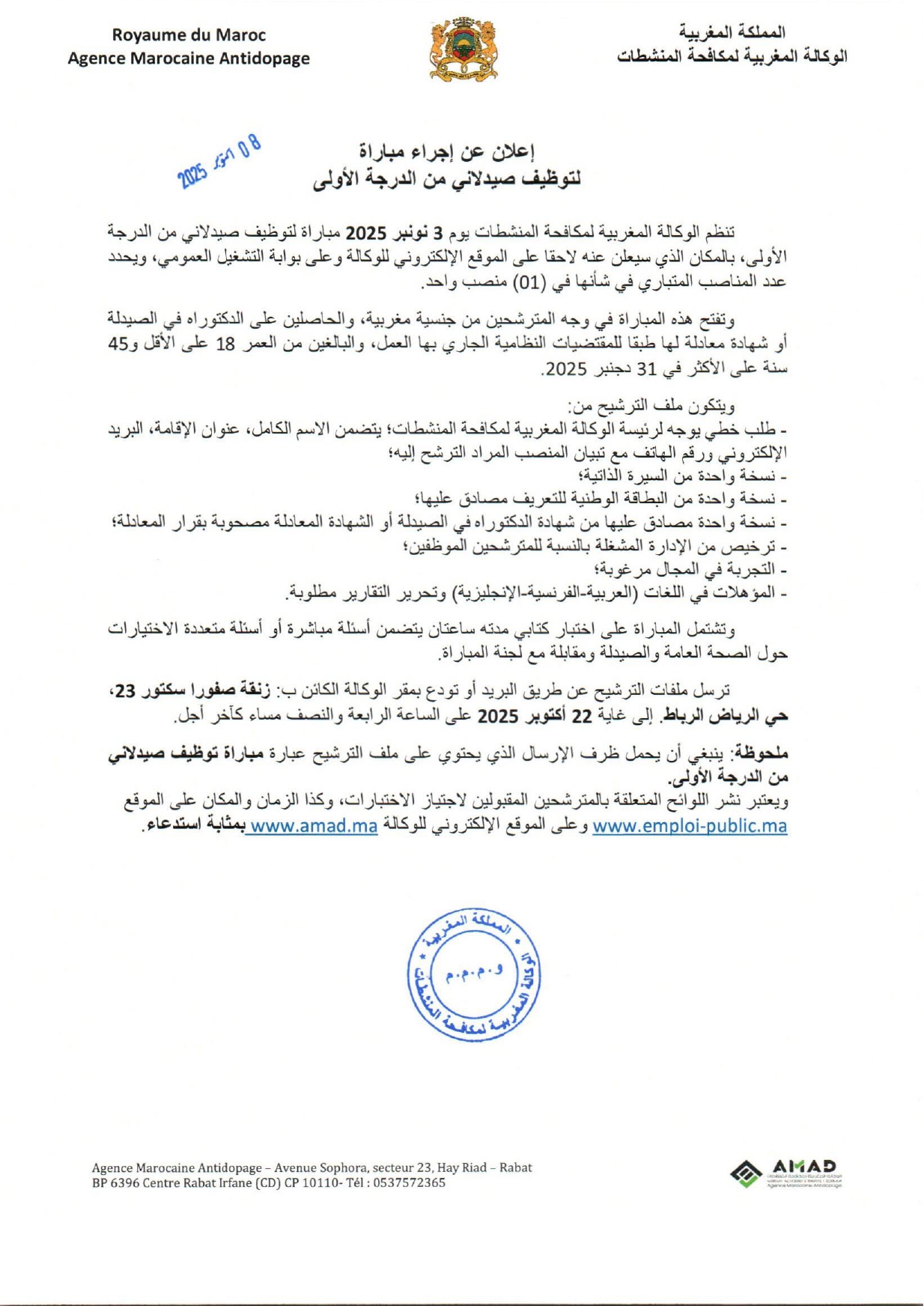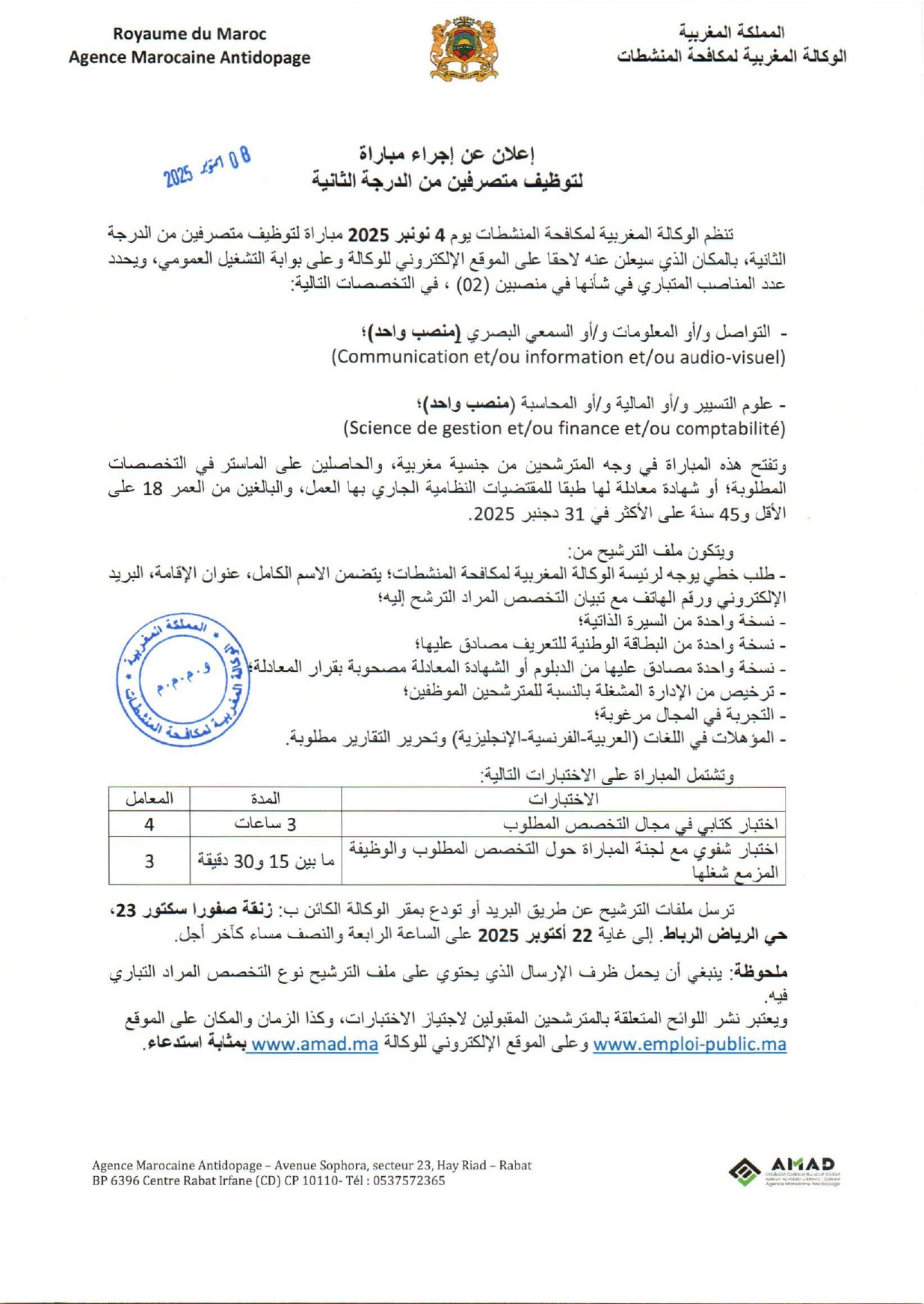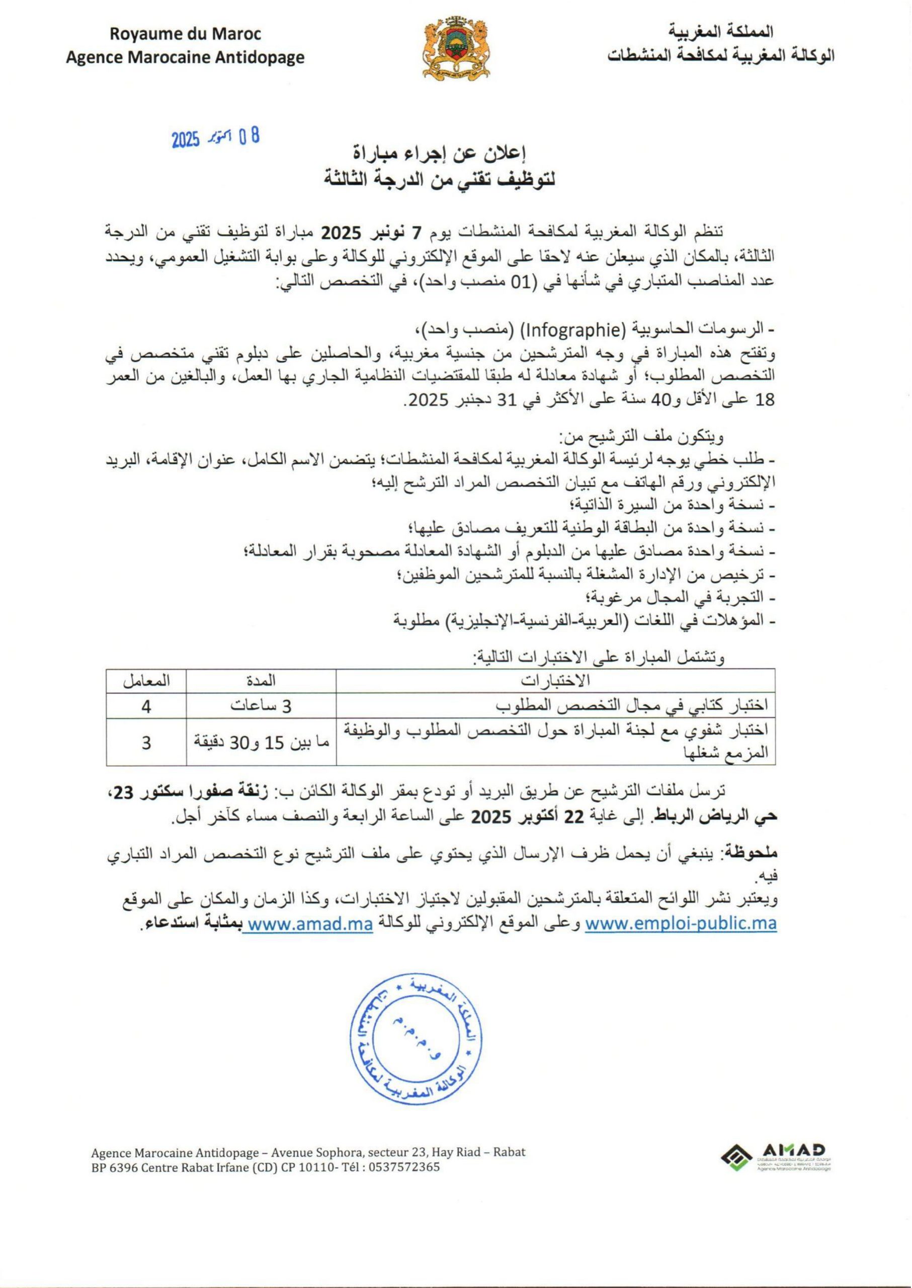 Avis de concours de recrutement au titre de l’année 2025