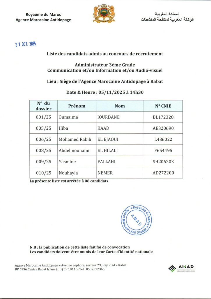 Liste des candidats admis au concours de rectrutement : Administrateur 3ème grade communication et/ou information et/ou audio-visuel